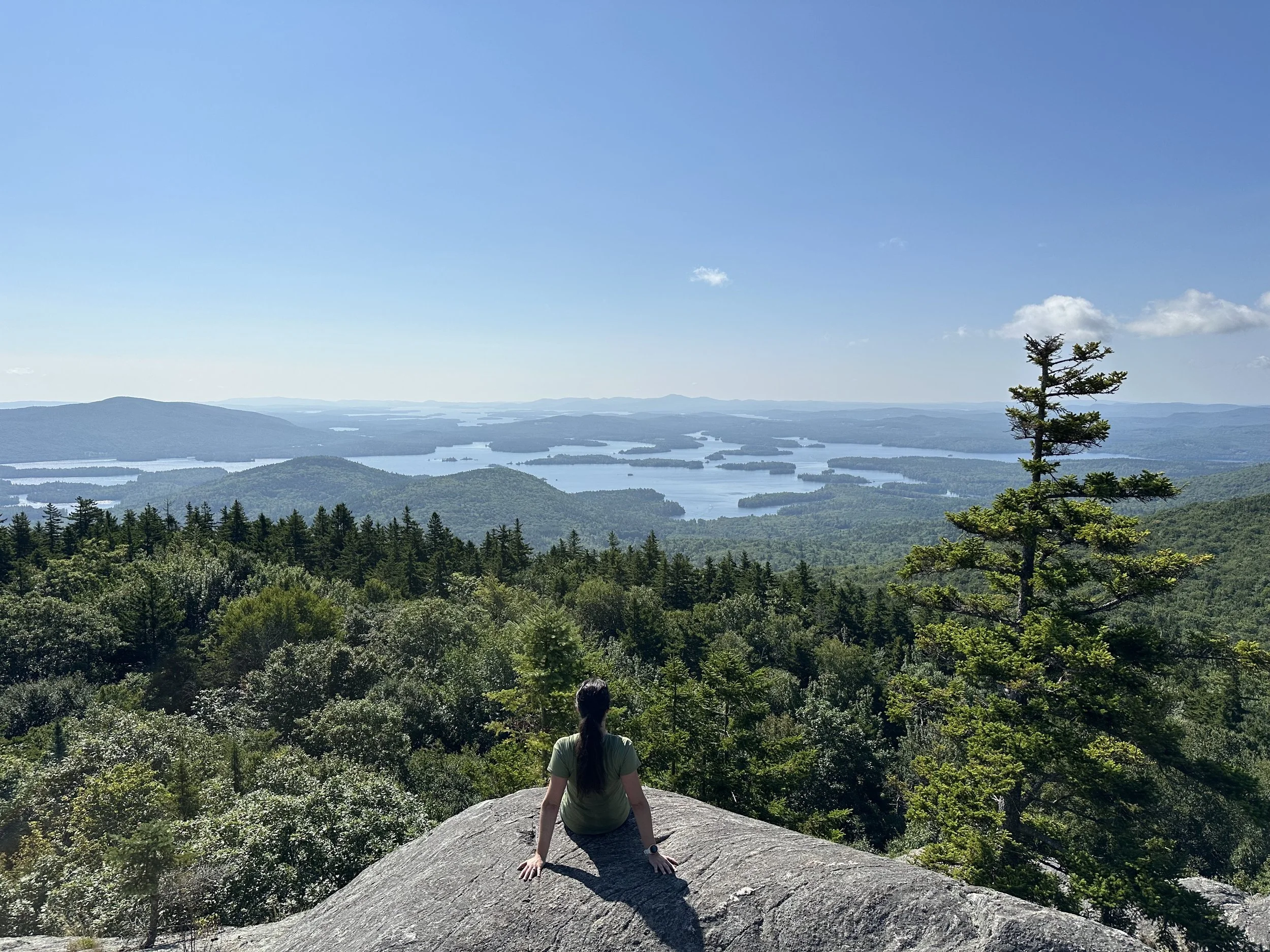 Soon enough, we made it to the viewpoint just before the summit of Mount Morgan. The views overlooking Squam Lake were stunning even though some wildfire smoke was in the air, and we sat there for almost 20 minutes, eating snacks and enjoying the views.