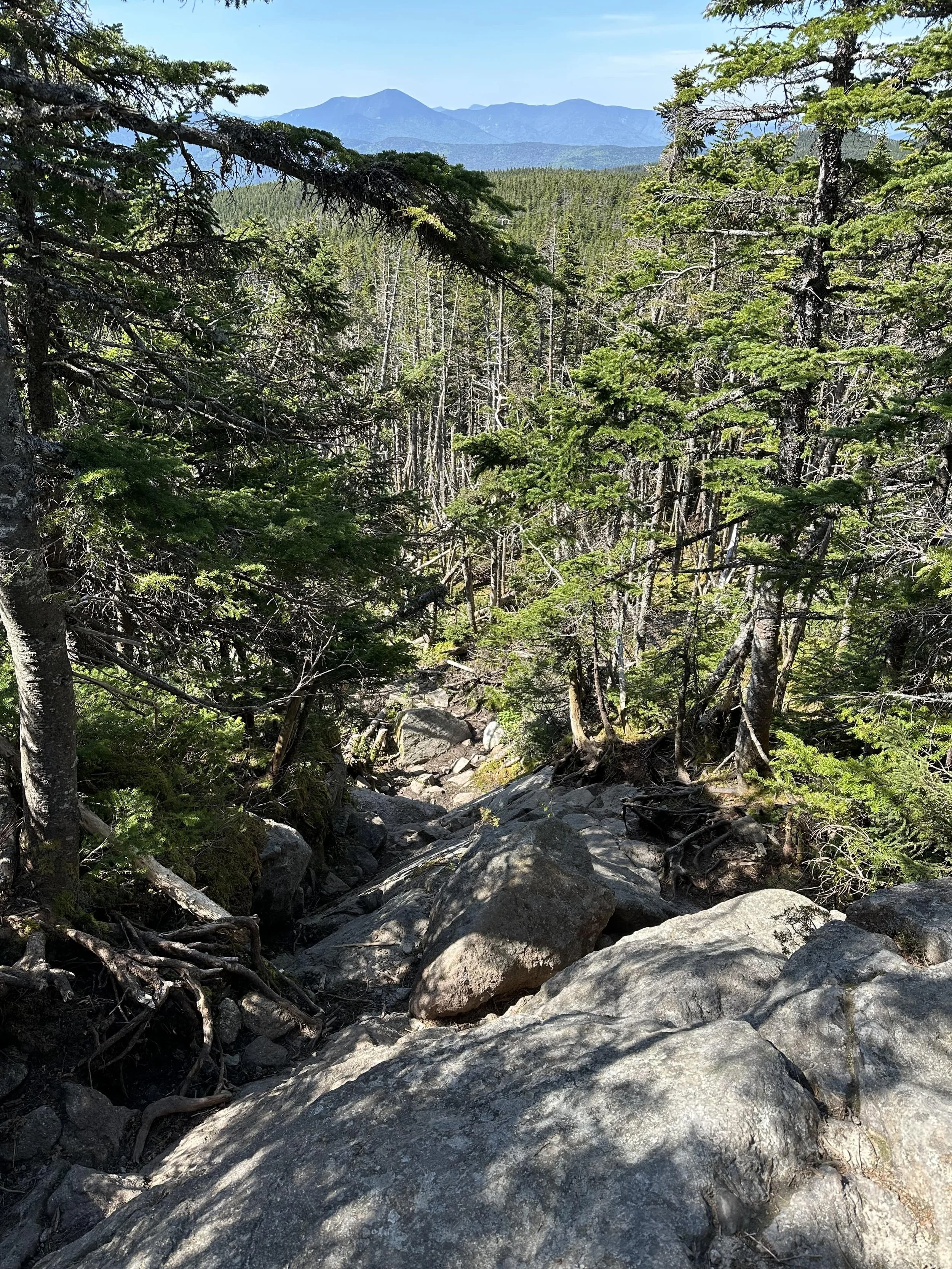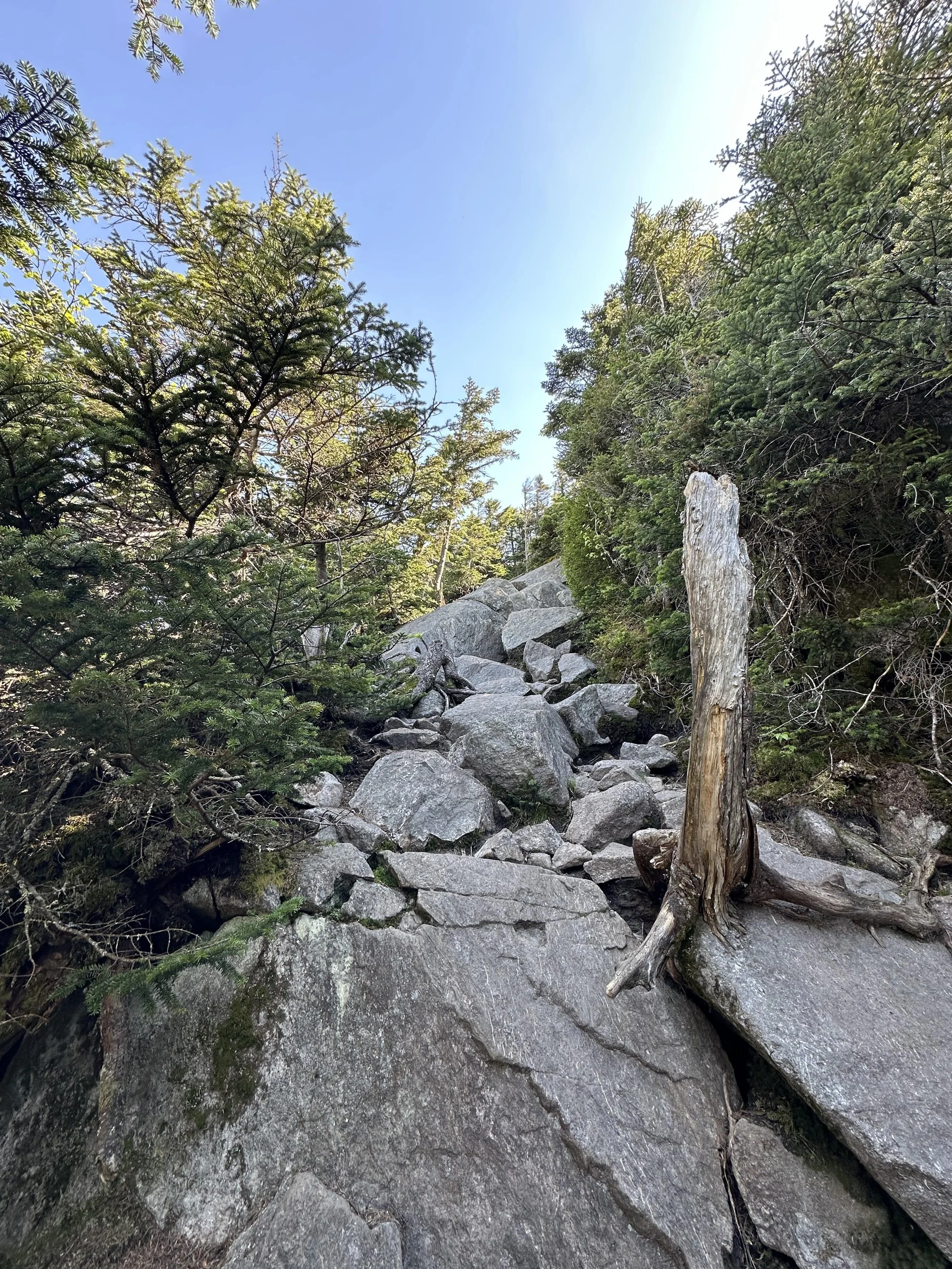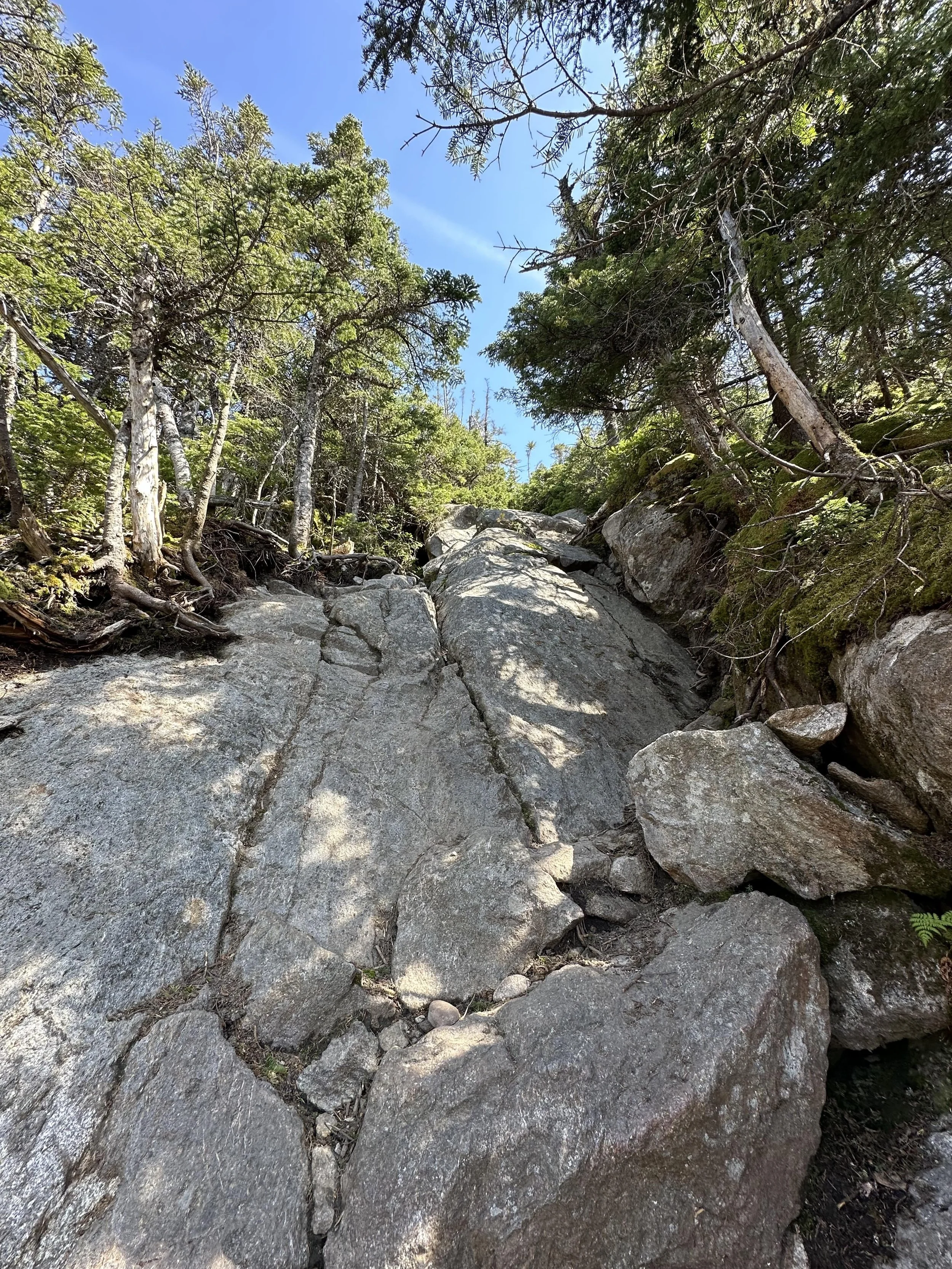 The black flies were so bad on Mount Webster, and I was getting bit a lot. I took some photos before quickly heading back into the treeline to begin the descent and run away from the bugs. I followed the trail back to the Webster-Jackson Trail junction and took a left to begin my descent on the loop. The first mile on the descent was steep, rocky, and wet. It made it a bit precarious, and I was moving slowly because of the slick rock.